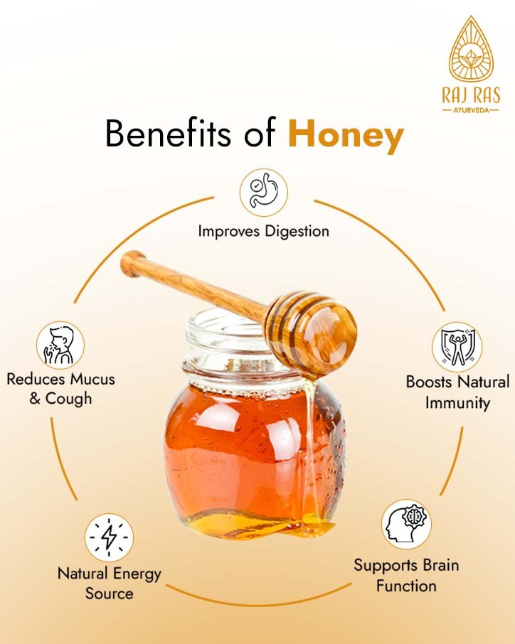 Honey supports digestion, boosts immunity, provides natural energy, and helps reduce excess mucus in the body.